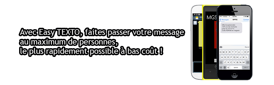 Easy TEXTO est un ensemble de services mis à votre disposition pour faciliter votre relation client. Cette solution se démarque des autres « web services » par son ensemble d’outils et de services proposés. En effet, Easy TEXTO est une boite à outils comprenant une application, mais aussi une équipe à votre écoute qui saura vous conseiller sur le choix du meilleur support parmi les Texto, MMS, Landing Page, SMS voix, mails… et ceci en fonction de vos besoins. Quel que soit votre besoin, pour qu’une communication ait un bon retour il faut qu’elle utilise le bon support. Contactez-nous afin que nous puissions discuter de vos projets ensemble.